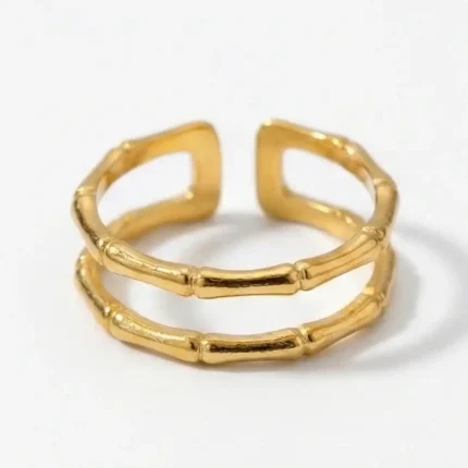 Original price was: ₹999.00.₹399.00Current price is: ₹399.00.Modern Bamboo Double Band Gold-Plated Steel Ring – Free Size
