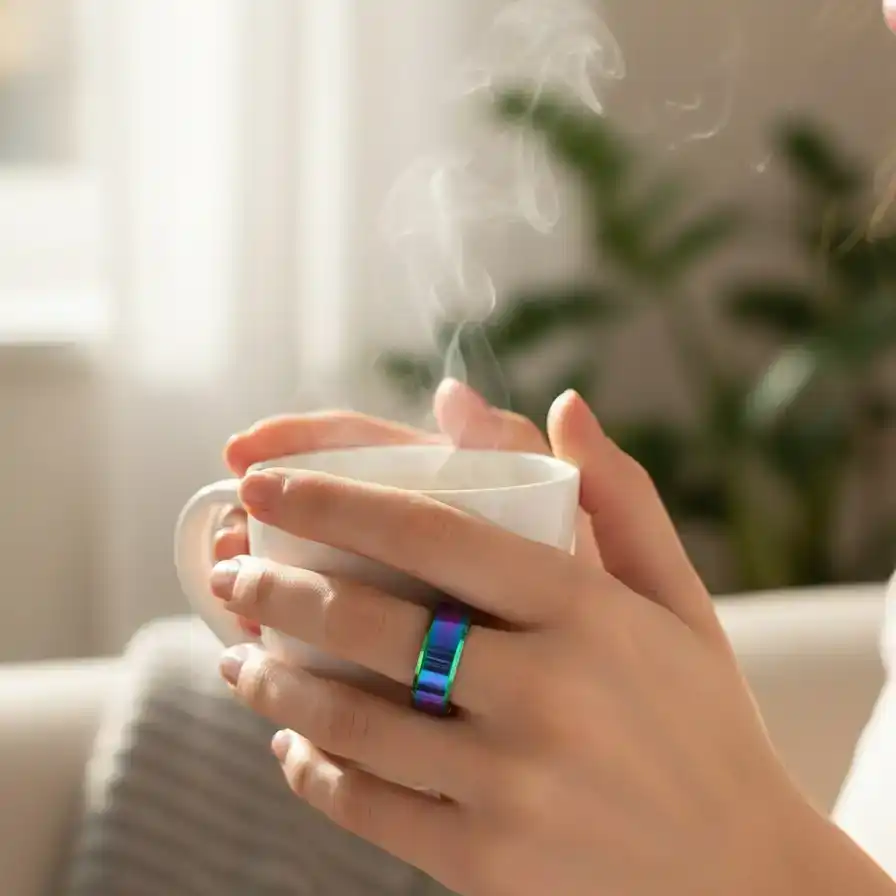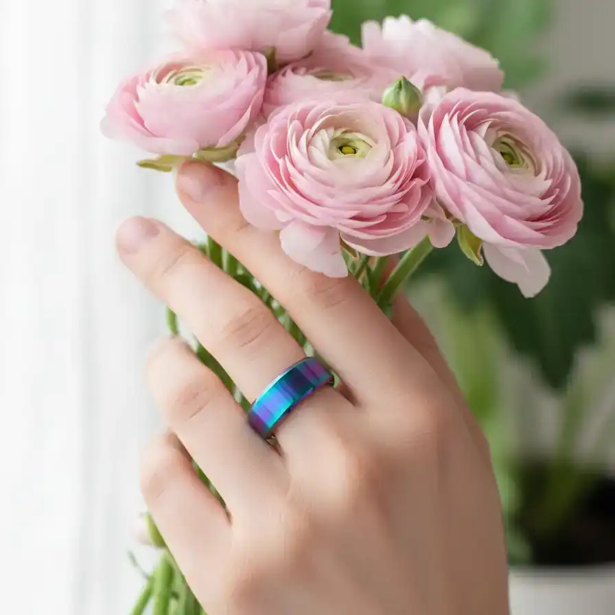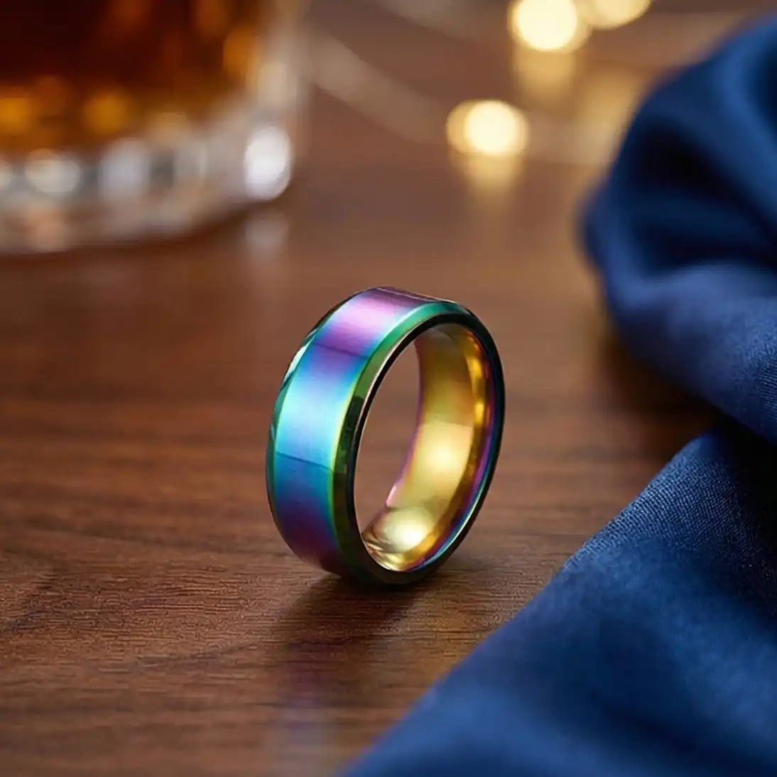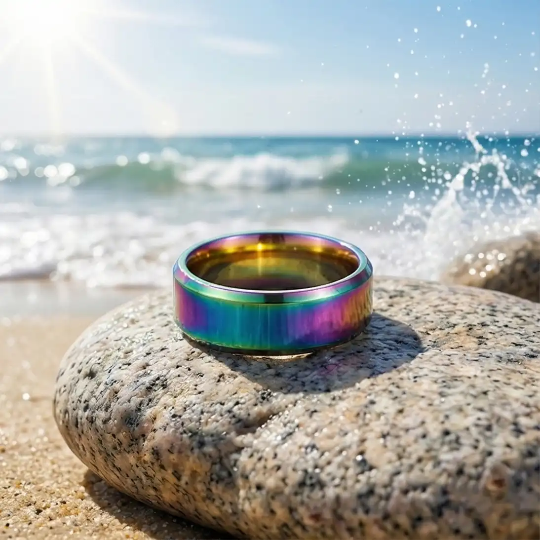 Vibrant Aesthetic Appeal: The Costozon Rainbow Ring features a stunning, iridescent finish that shifts colors between blues, greens, purples, and golds depending on the light. This unique PVD plating process ensures no two angles look exactly the same, offering a modern and playful twist on the classic wedding band.