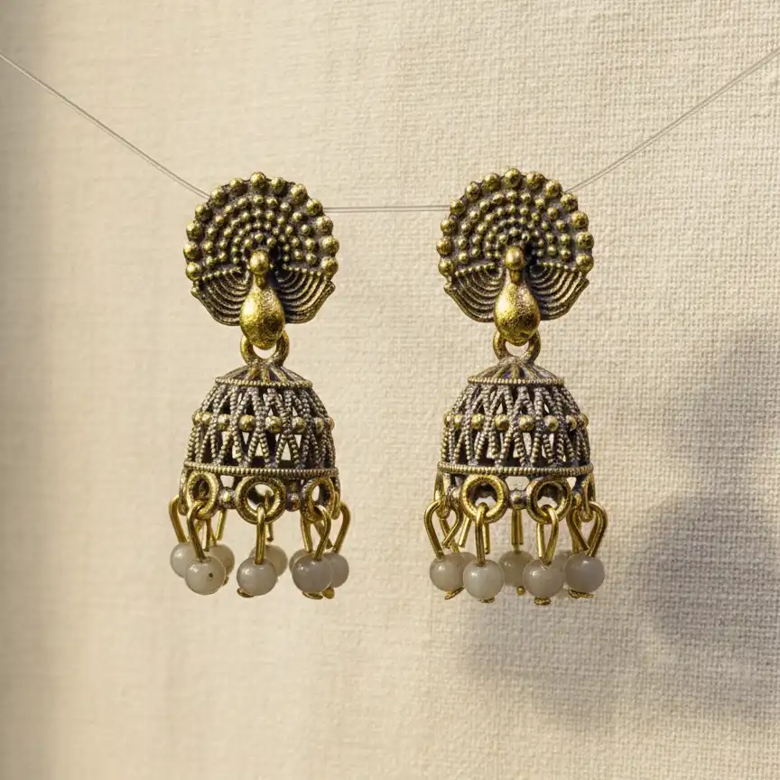 The stud of the earring features a majestic, finely detailed peacock motif—a classic Indian symbol of grace, beauty, and royalty—framed by a halo of delicate beaded metalwork. Suspended below is a beautifully crafted traditional dome (jhumki) adorned with intricate mesh and filigree patterns. The design is elegantly finished with a cluster of smooth, muted-tone bead danglers that create a soft, graceful movement with every step you take. Bathed in a rich, antique gold finish, these earrings exude a vintage charm that looks like a treasured family heirloom.