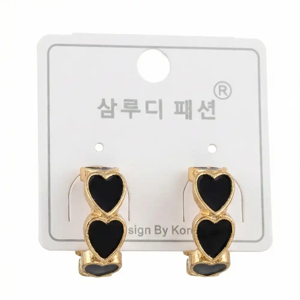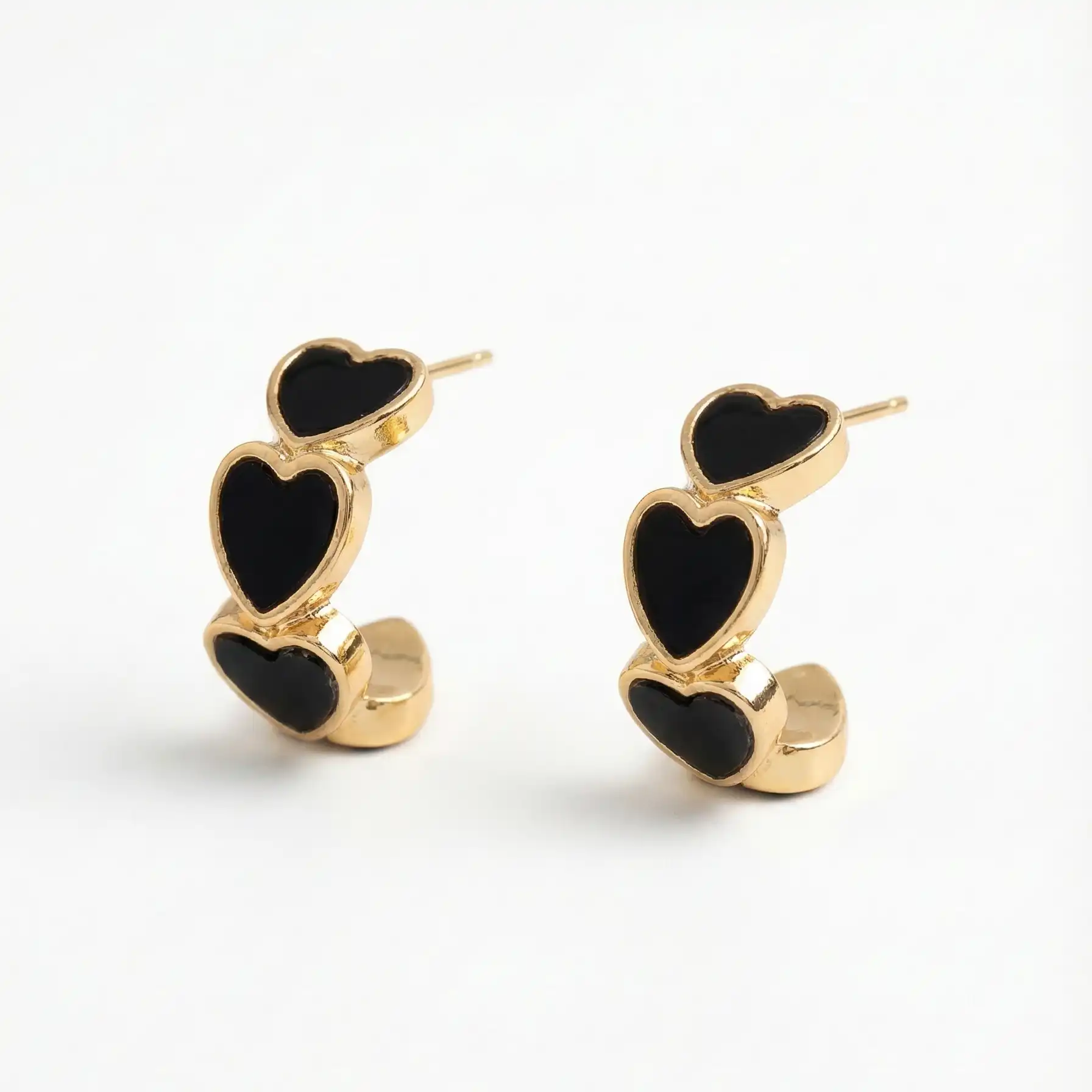 The Perfect Blend of Edge and Elegance: Elevate your ear stack with the Costozon Black Heart Hoops. Featuring a striking contrast between the radiant gold finish and deep black enamel hearts, these earrings offer a modern twist on the classic hoop. The “triple heart” stacking design creates a visual illusion of multiple piercings, making them a standout accessory for any outfit.