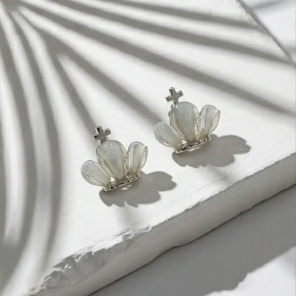 The crown body features a pearl-like translucent finish with a soft glow that reflects light beautifully. This subtle shimmer gives the earrings a luxurious appearance without being overly flashy, making them suitable for both daytime and evening wear.