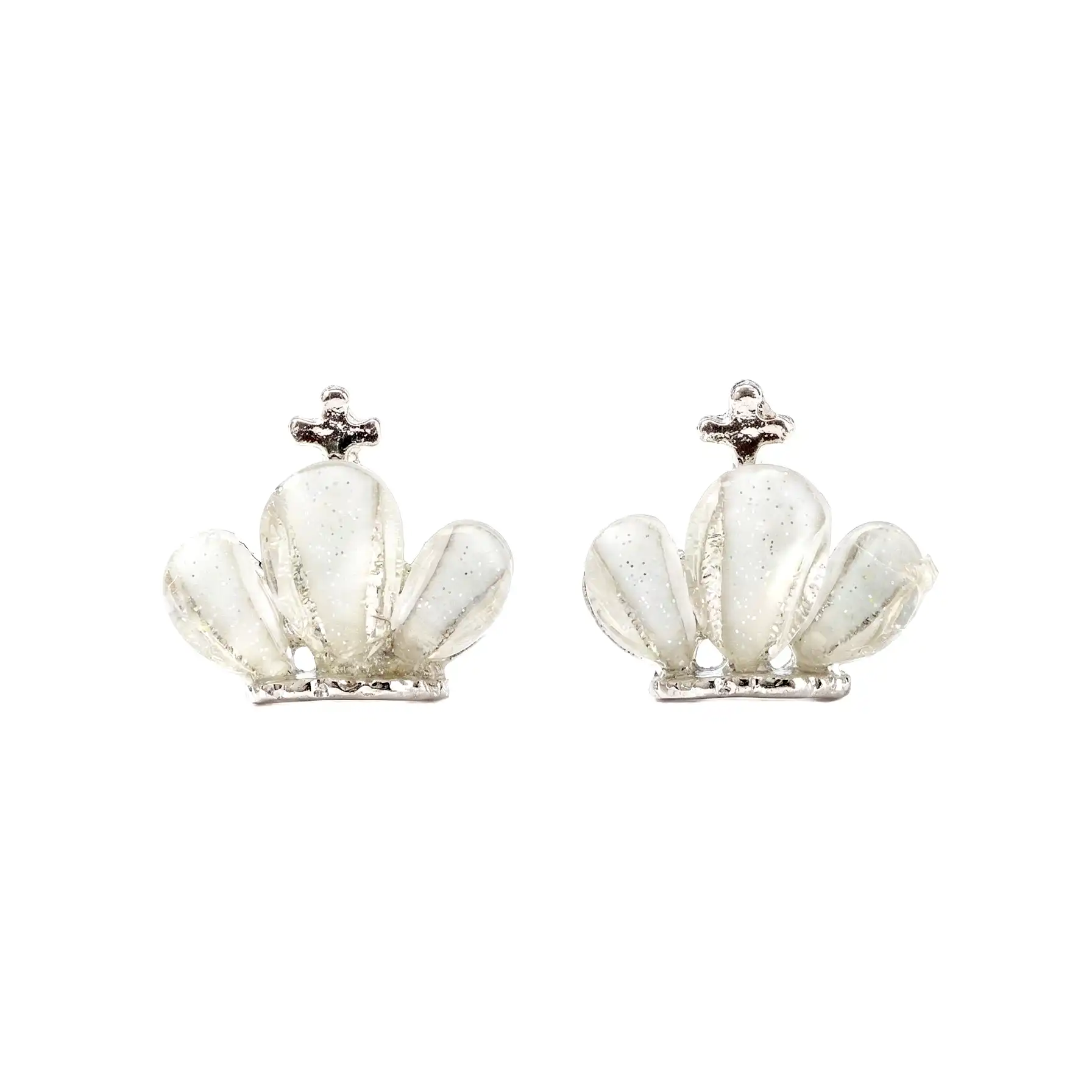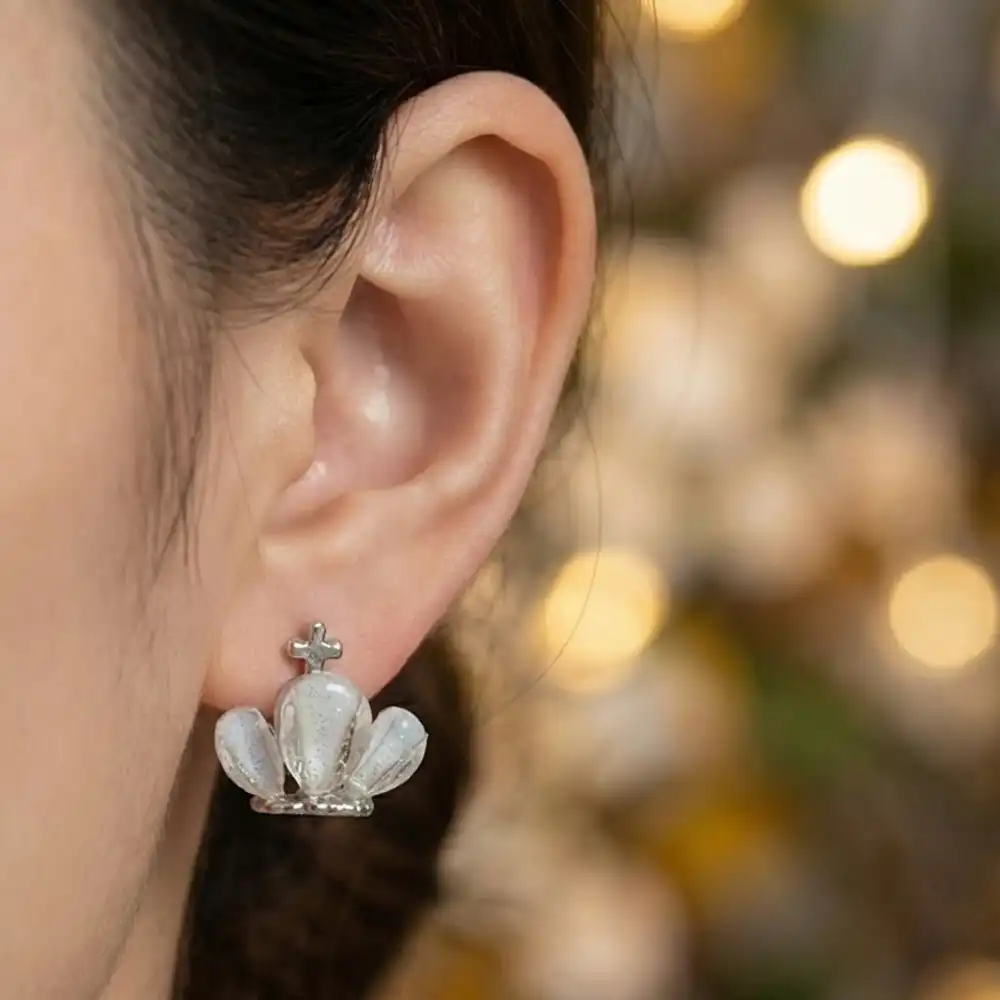 Beautiful crown-shaped stud earrings featuring a soft pearl-effect translucent finish that delivers a subtle glow and timeless elegance for everyday and occasion wear.