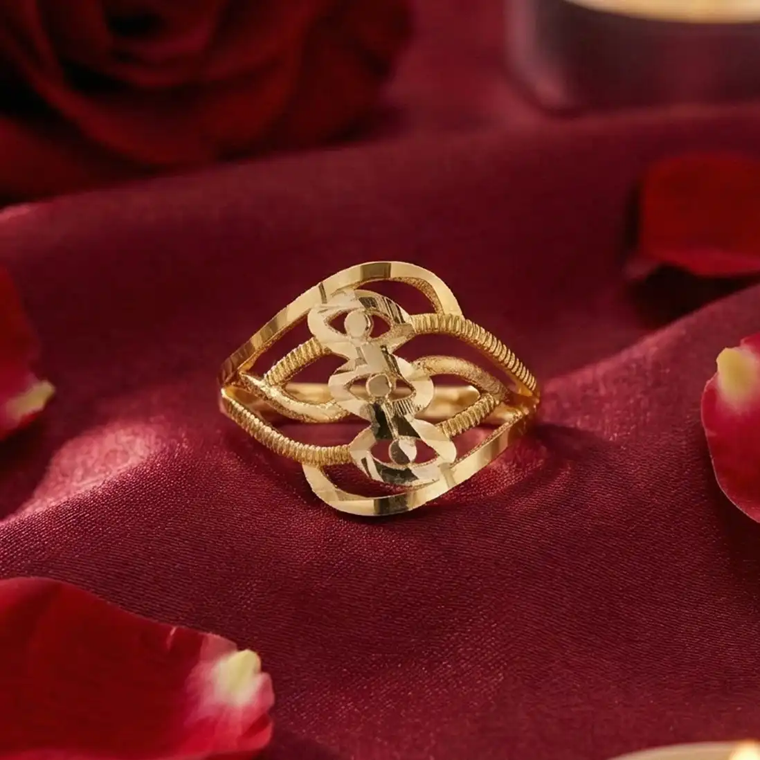 The centerpiece of this exquisite ring is its intricate cut-out pattern. Inspired by the sprawling gardens of royal palaces and the fine “Pachchikari” work of traditional artisans, the design features a series of interconnected floral motifs and lace-like swirls. The “Filigree” technique used here creates an airy, lightweight feel, allowing your skin to peek through the golden latticework. This makes the ring not just a visual delight but a comfortable companion for all-day wear.