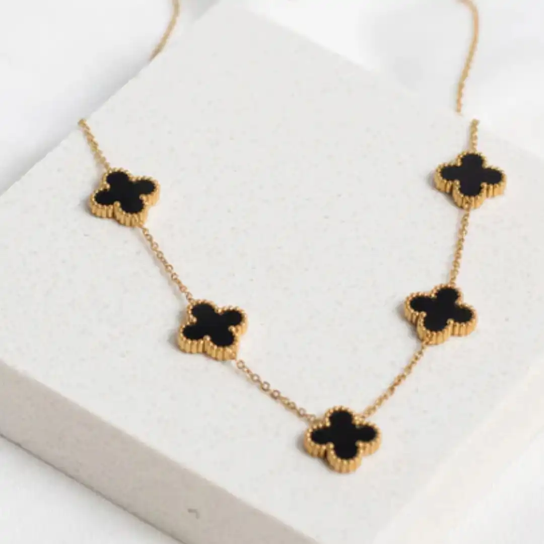 Double-Sided Brilliance: Each clover motif is meticulously inlaid with black onyx on both sides, ensuring that the necklace maintains its striking appearance even as you move.