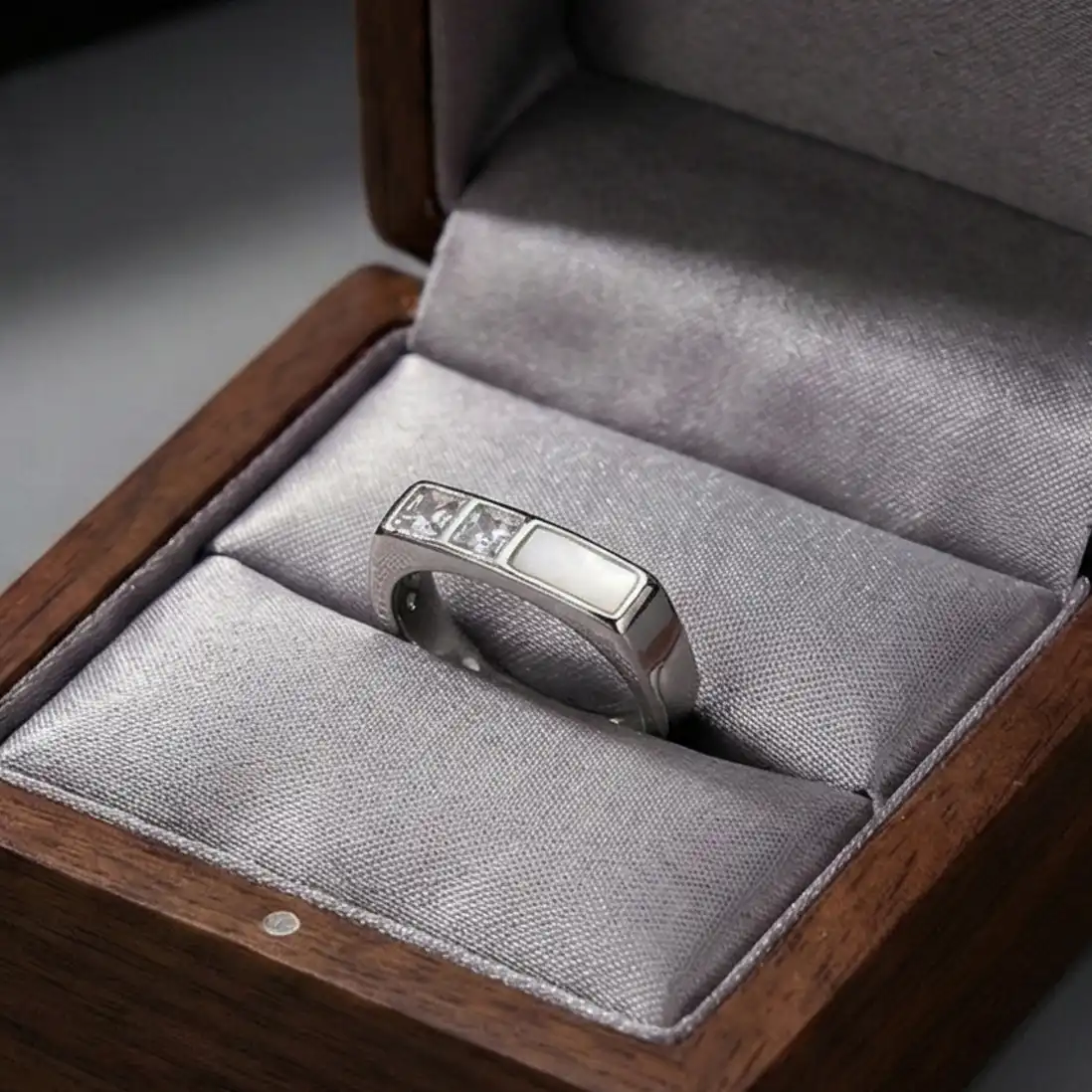 Twin Sparkle: Flanking the pearl inlay are two precision-cut Square Cubic Zirconia (CZ) stones. These high-grade crystals mimic the clarity and fire of real diamonds. The sharp, square “Princess Cut” shape reinforces the geometric theme of the ring, offering a brilliant contrast to the smooth, opaque glow of the pearl.
