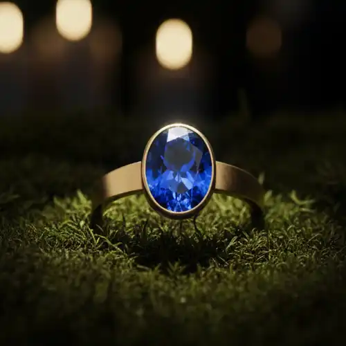1. Majestic Blue Centerpiece The focal point is the brilliant Oval-Cut [Blue Sapphire / Topaz]. Its deep navy hues symbolize wisdom, royalty, and inner peace. The faceted cut ensures it catches the light, offering a subtle yet luxurious sparkle.