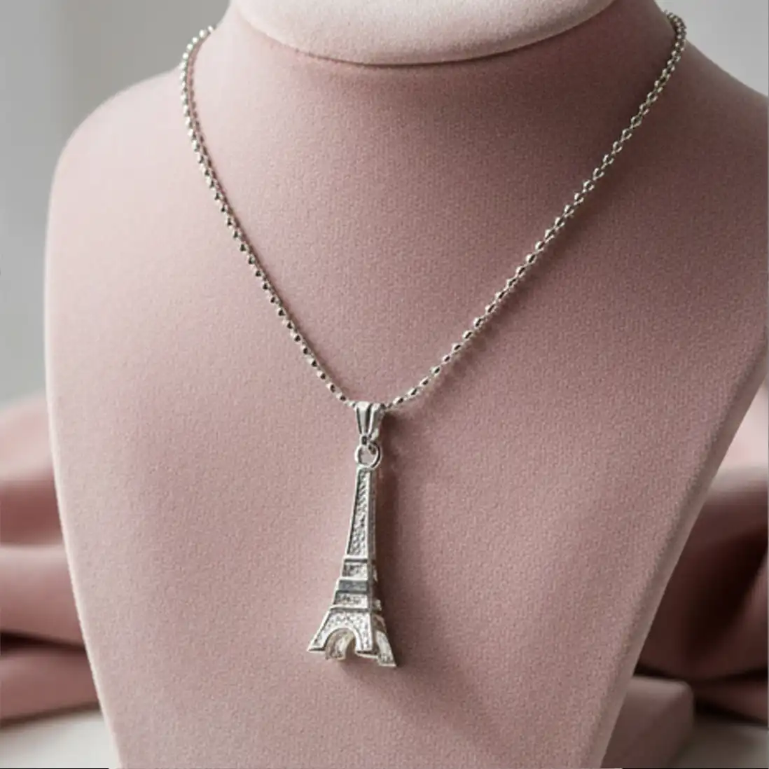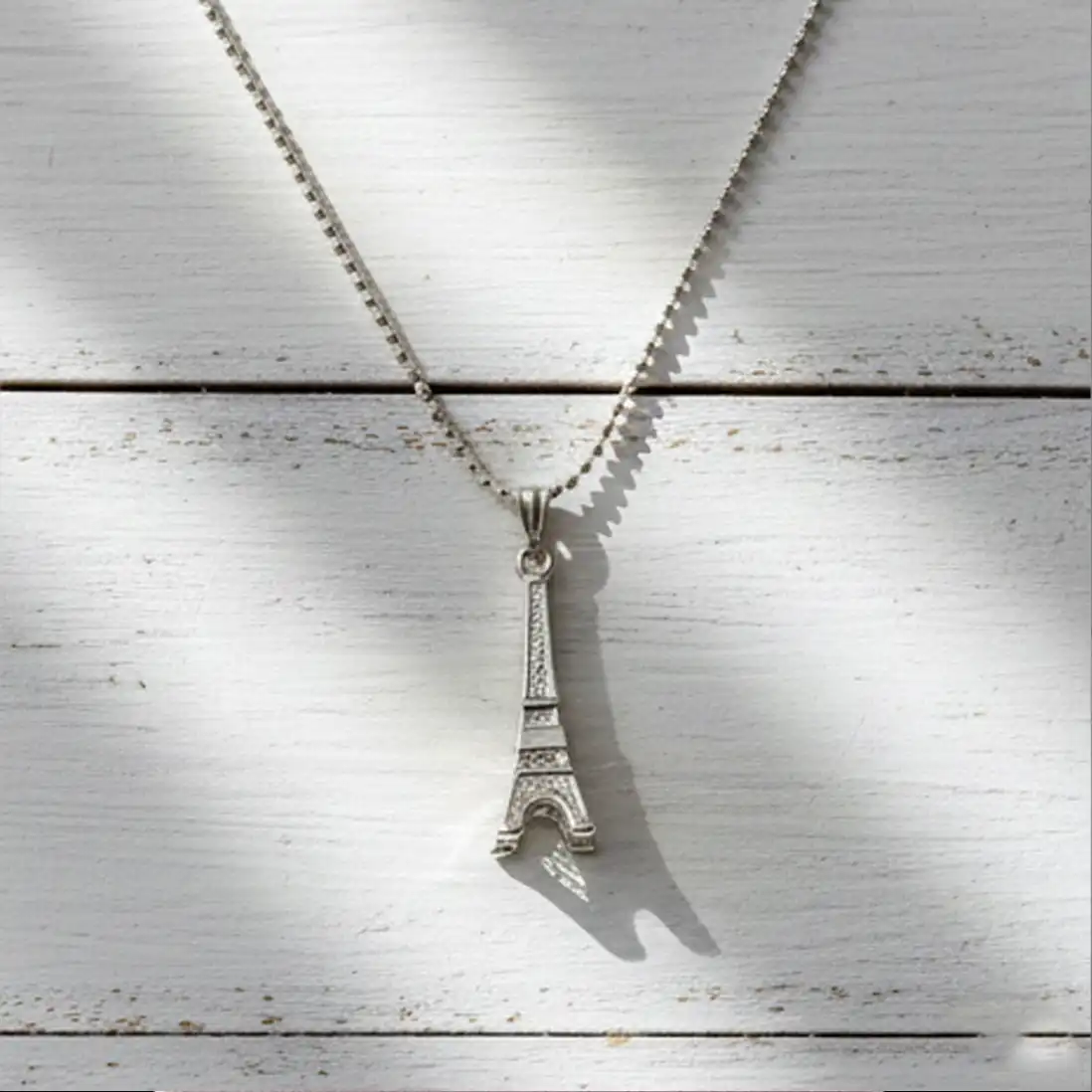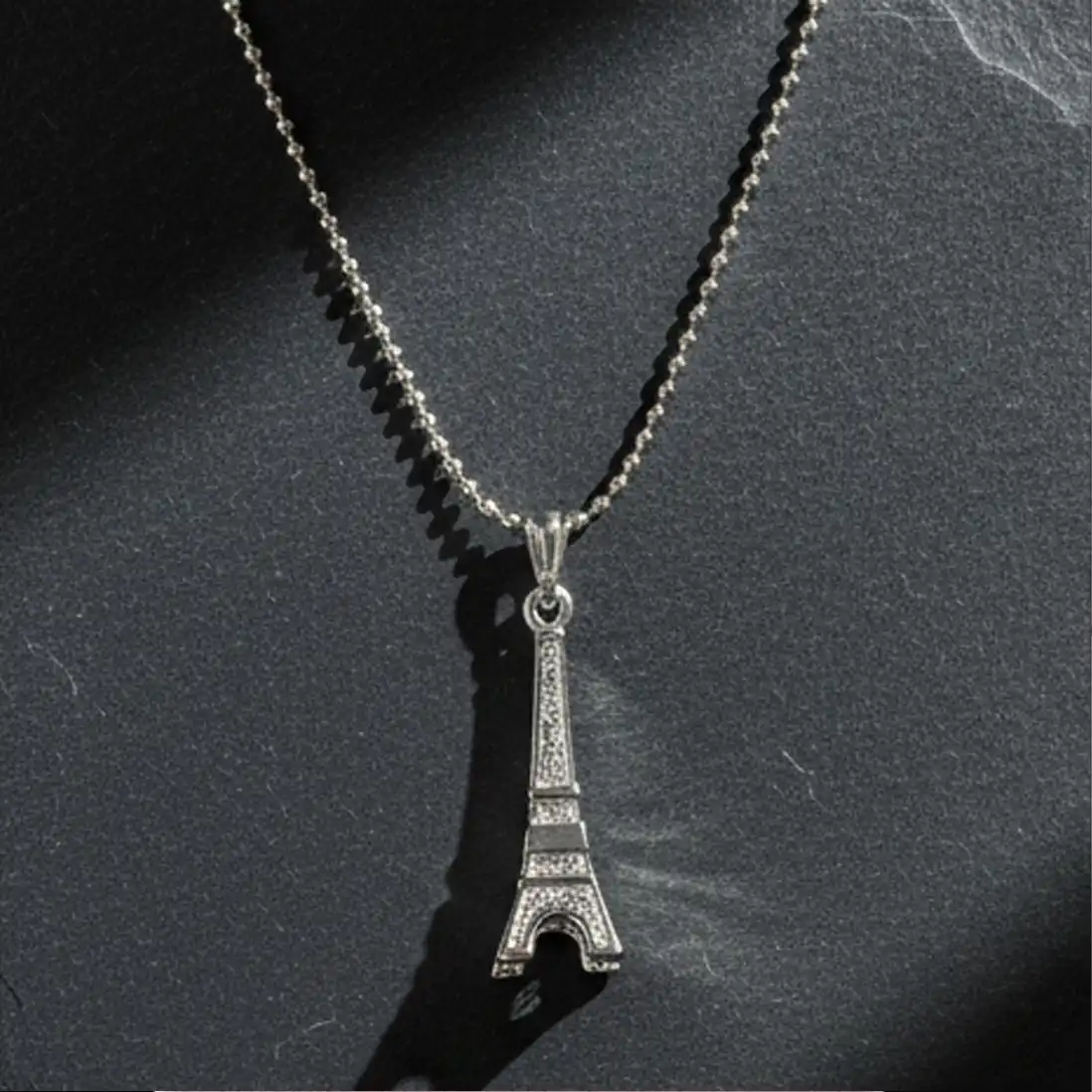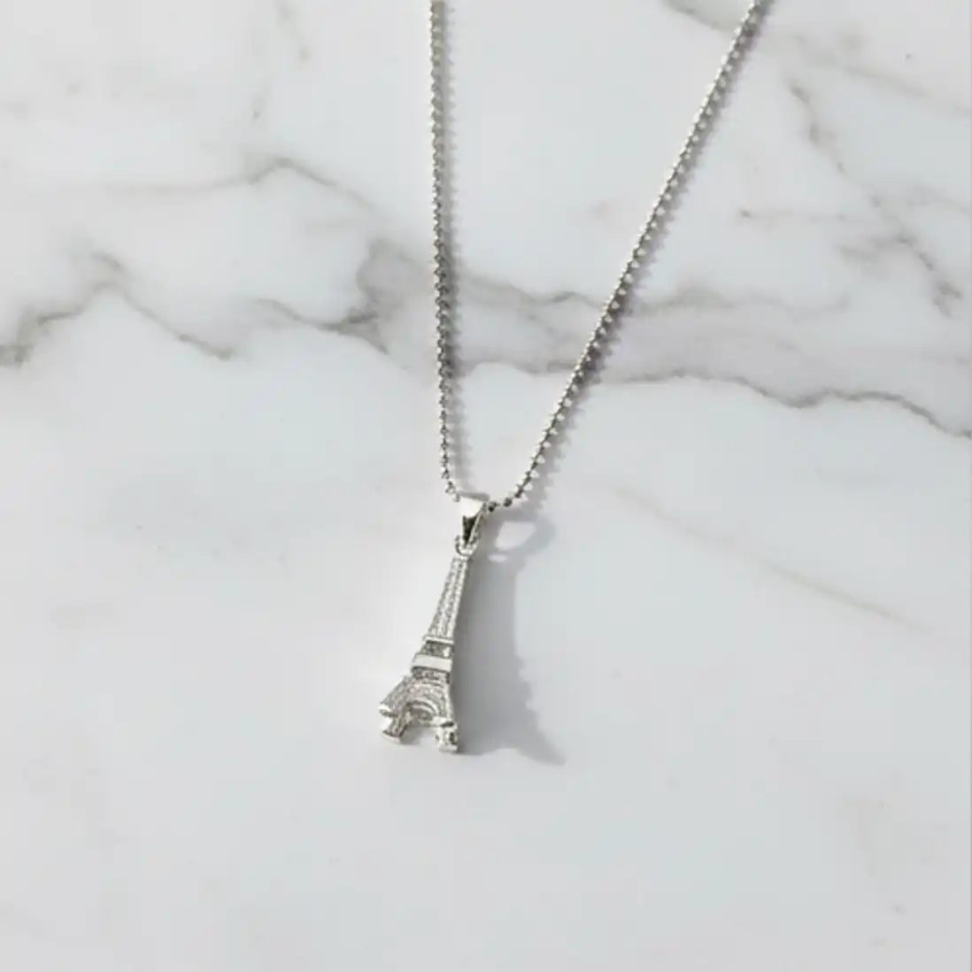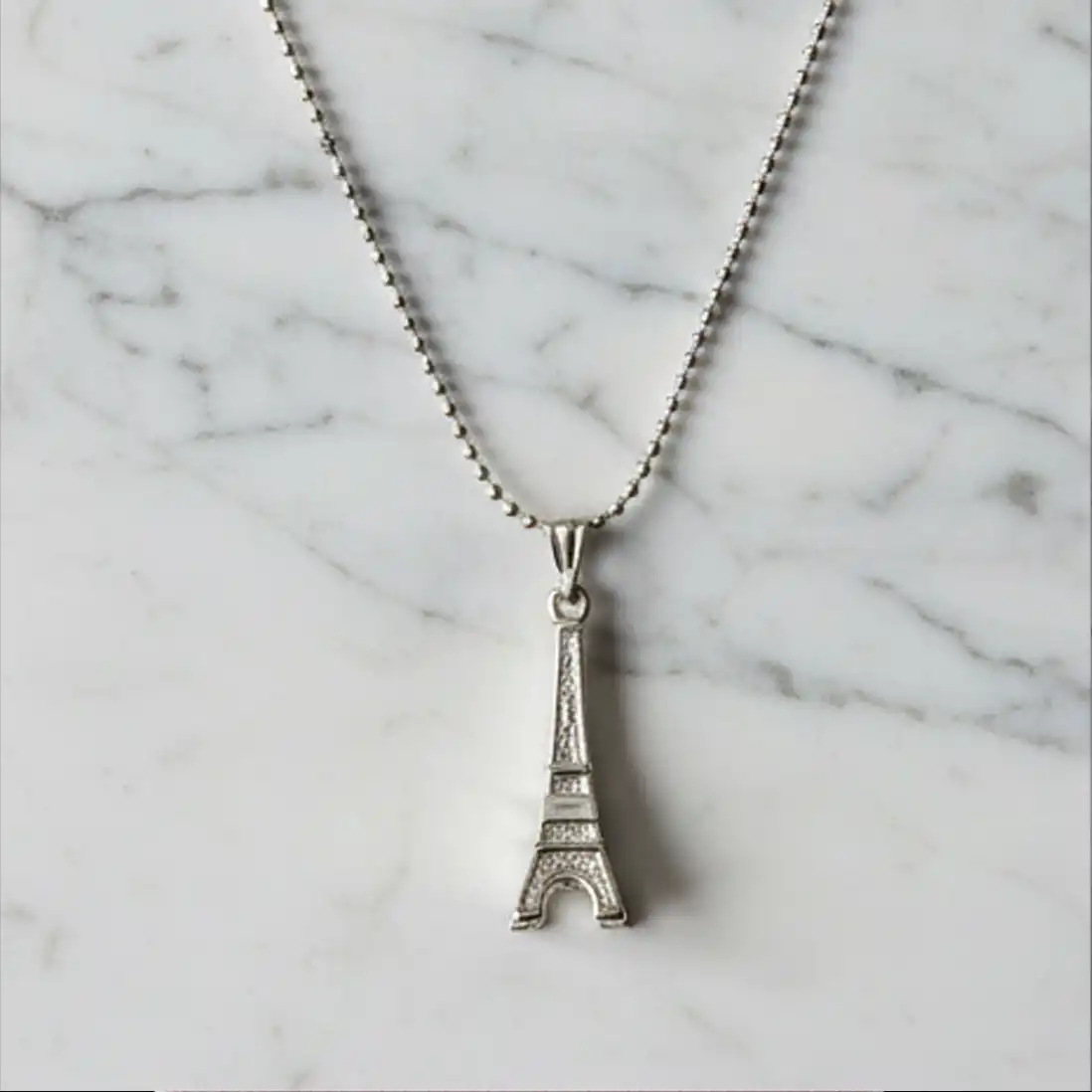 The focal point of this necklace is a beautifully crafted, three-dimensional miniature of the iconic Eiffel Tower. Cast in a gleaming, polished silver-tone metal, the pendant features a subtle structural texture that beautifully catches the light, mimicking the architectural wonder of the real monument. Suspended from a classic, lightweight bead (ball) chain, this necklace offers a relaxed, contemporary vibe that perfectly balances romantic nostalgia with modern everyday wearability.