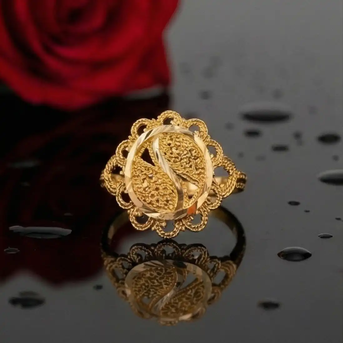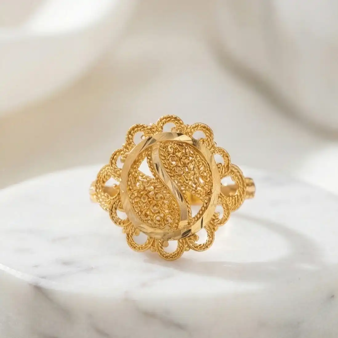 Traditional Rawa (Granulation) Border: The ring is framed by a scalloped border featuring “Rawa” work—tiny, raised metal beads that add a vintage, antique charm reminiscent of heirloom gold jewelry passed down through generations.