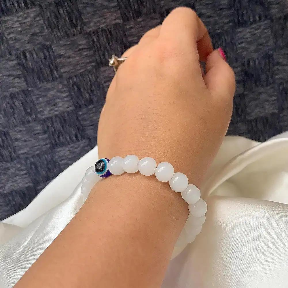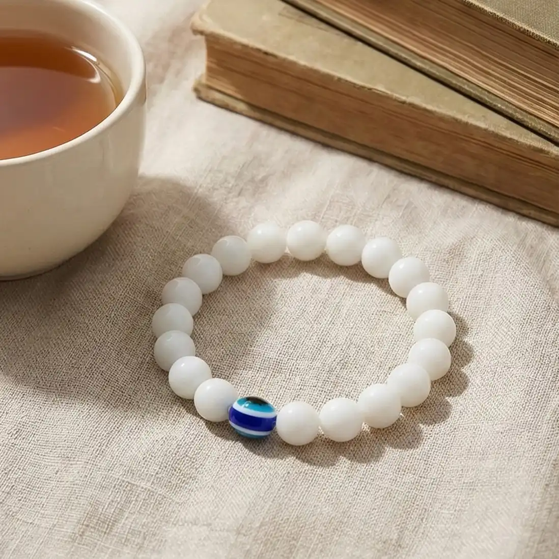 The bracelet is composed of glossy, round white beads (resembling White Jade or Milky Agate) that symbolize clarity and wisdom. Nestled amongst them is the focal point: a classic blue glass Evil Eye bead.